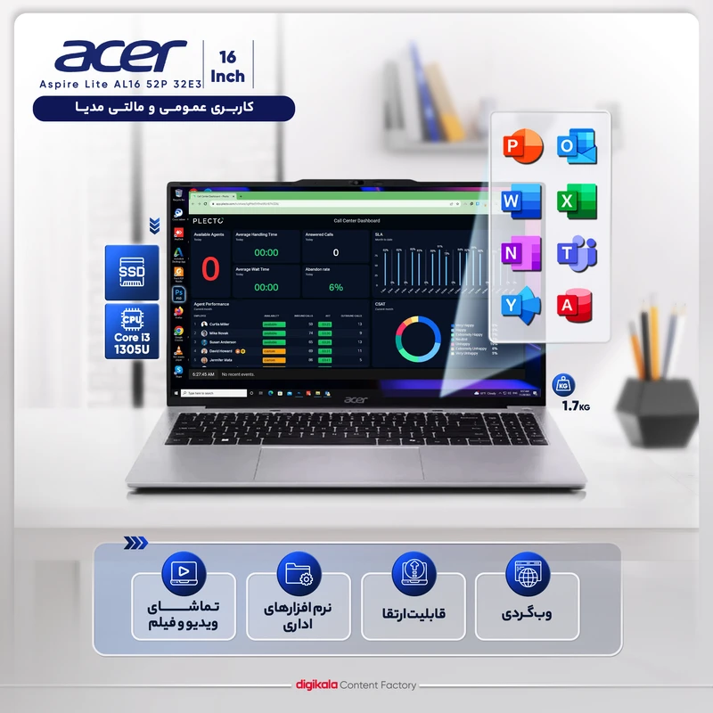 لپتاپ Acer Aspire Lite AL16 52P یکی از گزینههای سبک، کاربردی و اقتصادی این برند است که با بهرهگیری از پردازنده نسل سیزدهم اینتل و نمایشگر ۱۶ اینچی IPS، عملکردی متعادل و مناسب برای کاربران روزمره و حرفهای ارائه میدهد. این لپتاپ با وزن ۱.۷ کیلوگرم و ضخامت ۱۸.۹ میلیمتری، طراحی باریک و قابلحملی دارد که آن را برای دانشجویان، کارمندان و افرادی که به یک دستگاه کارآمد و سبک نیاز دارند، ایدهآل میکند. نمایشگر ۱۶ اینچی WUXGA با پنل IPS و وضوح ۱۹۲۰ در ۱۲۰۰ پیکسل، تجربه بصری باکیفیتی را فراهم میکند. نسبت تصویر 16:10 فضای بیشتری را برای کار با اسناد و مرور وب ارائه داده و زاویه دید ۱۷۰ درجهای آن باعث شده نمایشگر از زوایای مختلف کیفیت خود را حفظ کند. علاوه بر این، وبکم FHD 1080p و کیبورد کامل، آن را برای جلسات کاری و استفادههای روزمره به گزینهای مناسب تبدیل کرده است. این مدل از پردازنده نسل سیزدهم اینتل، واحد گرافیکی مجتمع UHD اینتل، حافظه رم DDR5 با فرکانس ۴۸۰۰ مگاهرتز و حافظه SSD بهره میبرد که سرعت و عملکرد دستگاه را در سطح بالایی قرار دادهاند. لپتاپ Aspire Lite AL16 در بخش ارتباطات نیز مجموعهای از درگاههای متنوع شامل USB-A، USB-C، HDMI، جک ۳.۵ میلیمتری صدا و شیار کارت حافظه را در اختیار کاربران قرار میدهد. همچنین، این مدل از وایفای 6 و بلوتوث 5.1 پشتیبانی میکند. باتری ۵۸ واتساعتی دو سلولی این دستگاه نیز میتواند تا پنج ساعت هنگام تماشای ویدیو شارژدهی داشته باشد که برای استفاده روزمره کافی به نظر میرسد.