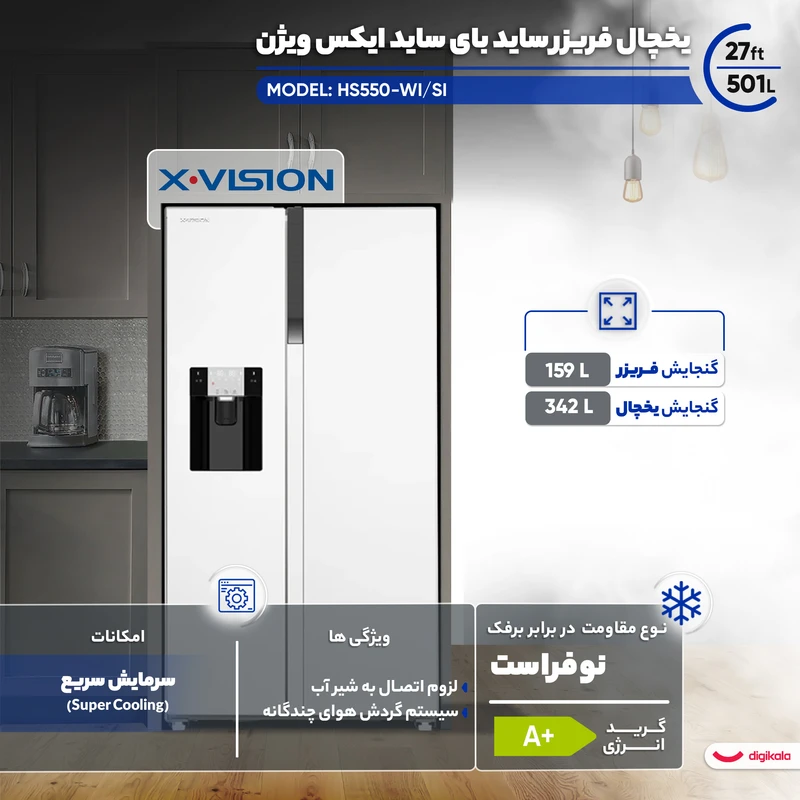 یخچال فریزر ساید بای ساید ایکس ویژن مدل HS550-WI/SI، با ارائهی گنجایش بسیار زیاد، طراحی زیبا و مدرن، مجموعهای کامل از فناوریهای پیشرفتهی خنککننده و حفظ تازگی، و بهرهوری انرژی فوقالعادهی A++ به لطف کمپرسور اینورتر، یک انتخاب بینظیر و سرمایهگذاری ارزشمند برای خانوادههای ایرانی است که به دنبال دستگاهی مطمئن، کارآمد، با کیفیت، جادار و بسیار کممصرف برای نگهداری طولانیمدت و بهینهی مواد غذایی خود هستند. این یخچال فریزر، فراتر از یک وسیلهی سرمایشی، یک مرکز مدیریت هوشمند طراوت و سلامت است که با ارائهی آب و یخ تصفیهشدهی همیشگی در سه حالت مختلف و کنترلهای پیشرفته، آسایش و سبک زندگی مدرن را برای شما به ارمغان میآورد و به کانون توجه و کارایی آشپزخانهی شما تبدیل خواهد شد.
